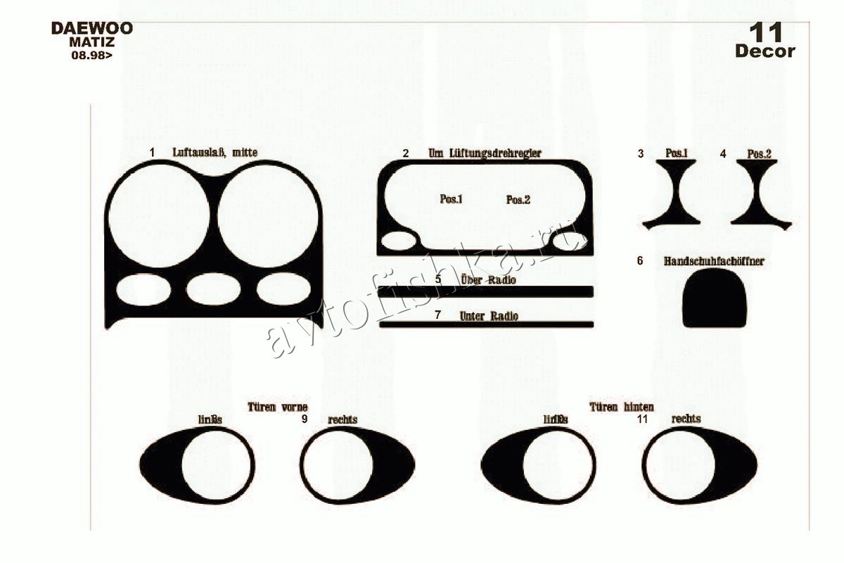 Декоративные накладки на панель приборов | Тюнинг салона для Daewoo Matiz 1998-2005 полный набор накладок в салон, 11 элементов