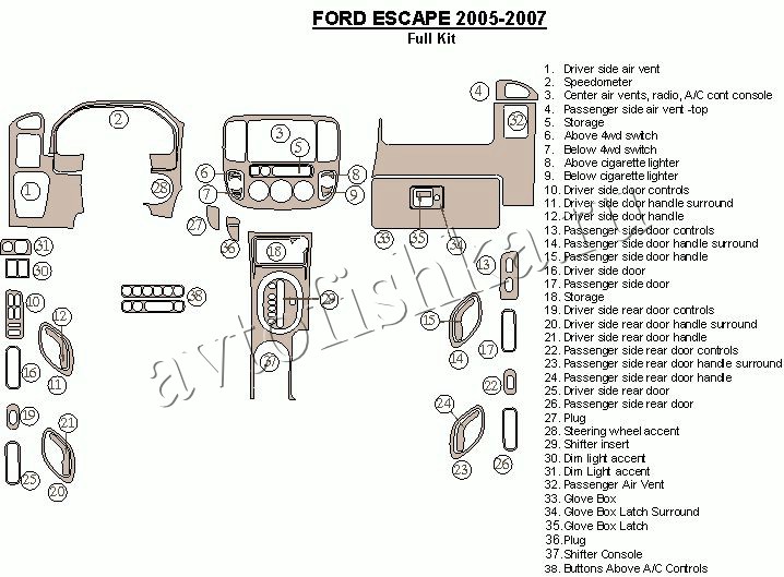 Декоративные накладки на панель приборов | Тюнинг салона для Ford Escape 2005-2006 полный набор накладок в салон