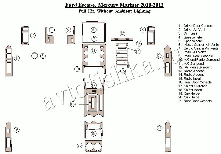 Декоративные накладки на панель приборов | Тюнинг салона для Ford Escape 2010-2012 полный набор накладок в салон без подсветки Ambient lighting.