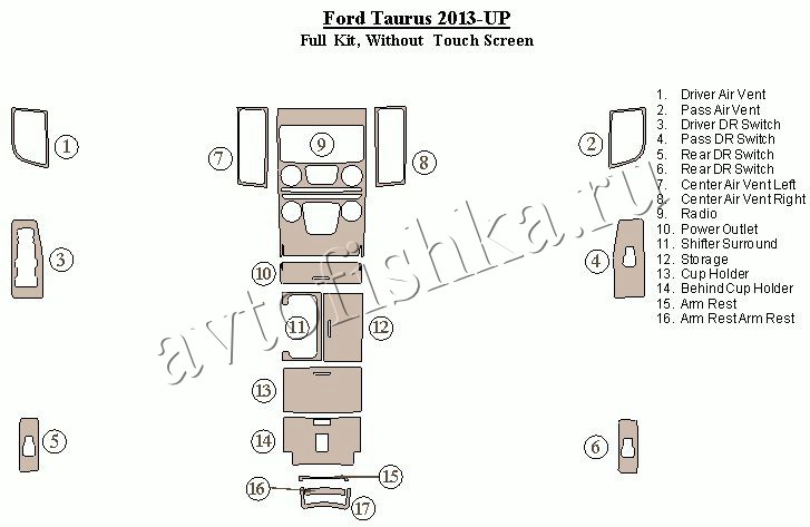 Декоративные накладки на панель приборов | Тюнинг салона для Ford Taurus 2013-н.в. полный набор накладок в салон, без Touch screen.