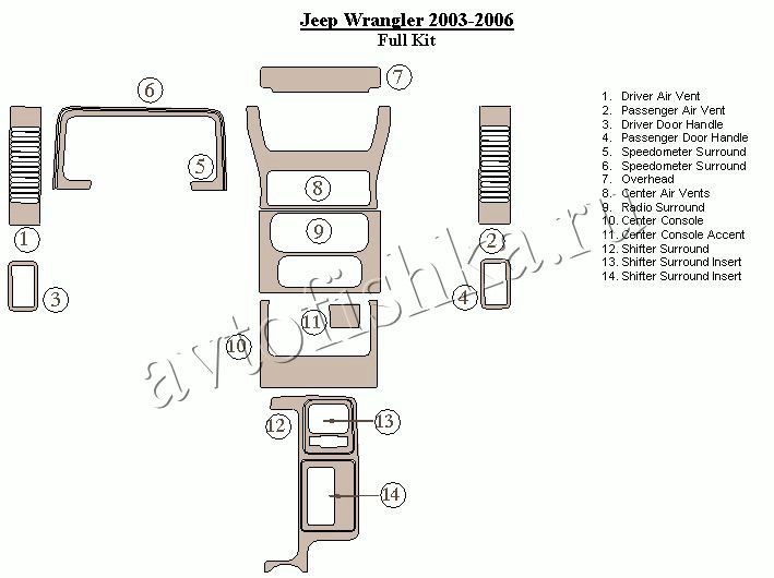 Декоративные накладки на панель приборов | Тюнинг салона для Jeep Wrangler 2003-2006 полный набор накладок в салон