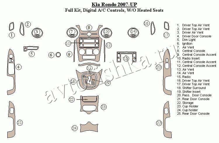 Декоративные накладки на панель приборов | Тюнинг салона для Kia Carens/Rondo 2007-н.в. полный набор накладок в салон, авто A/C контрольs, W/O подогрев сидений