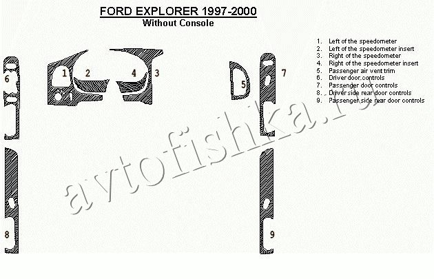 Декоративные накладки на панель приборов | Тюнинг салона для Mercury Mountaineer 1997-2001 базовый набор, 4 двери, 9 элементов.