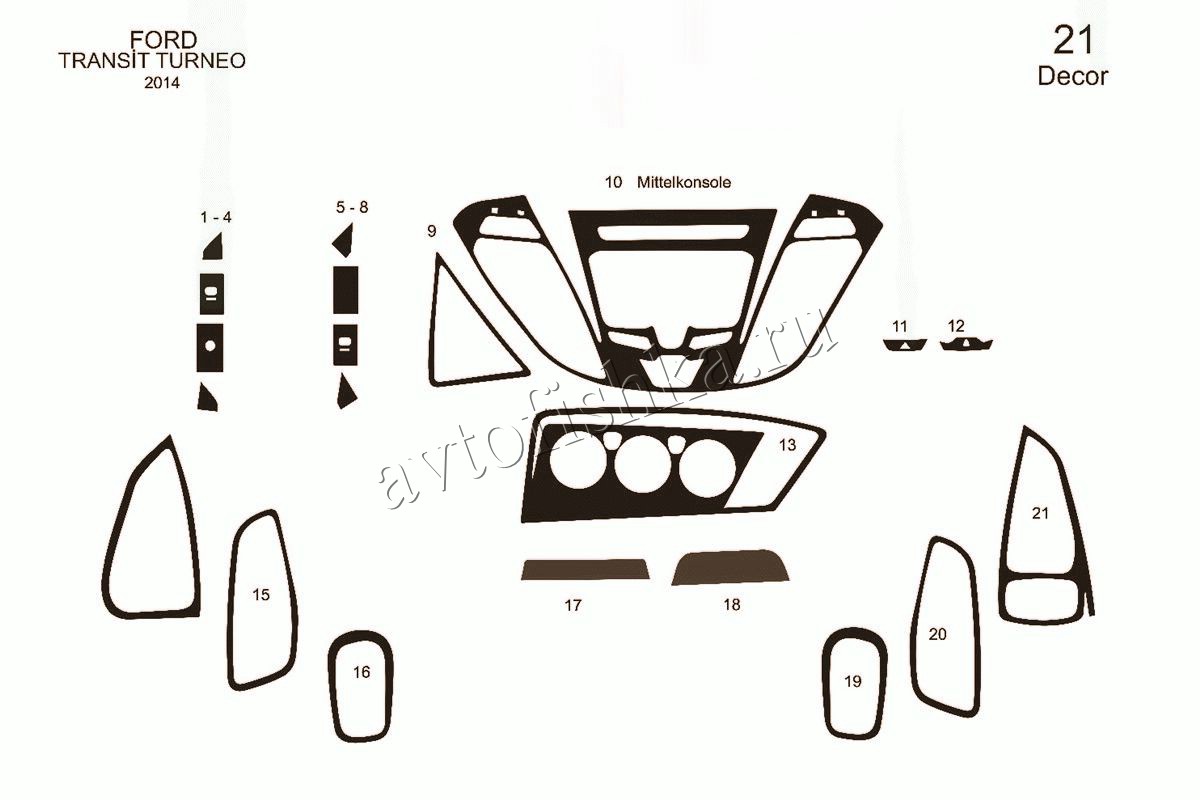 Декоративные накладки на панель приборов | Тюнинг салона для Ford Transit Tourneo 2014 – н.в. полный набор накладок в салон