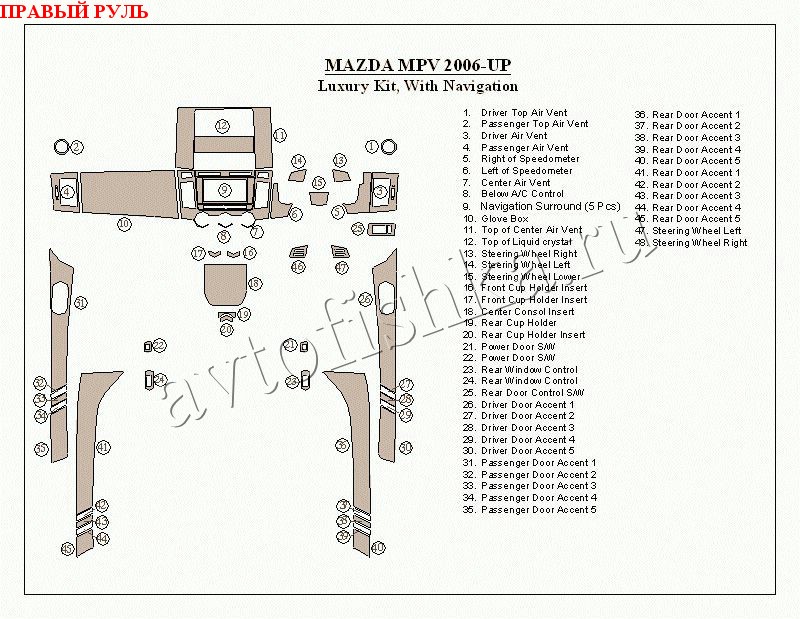 Декоративные накладки на панель приборов | Тюнинг салона для mazda mPV 2006 – н.в. Люксовый набор, С навигацией, правый руль