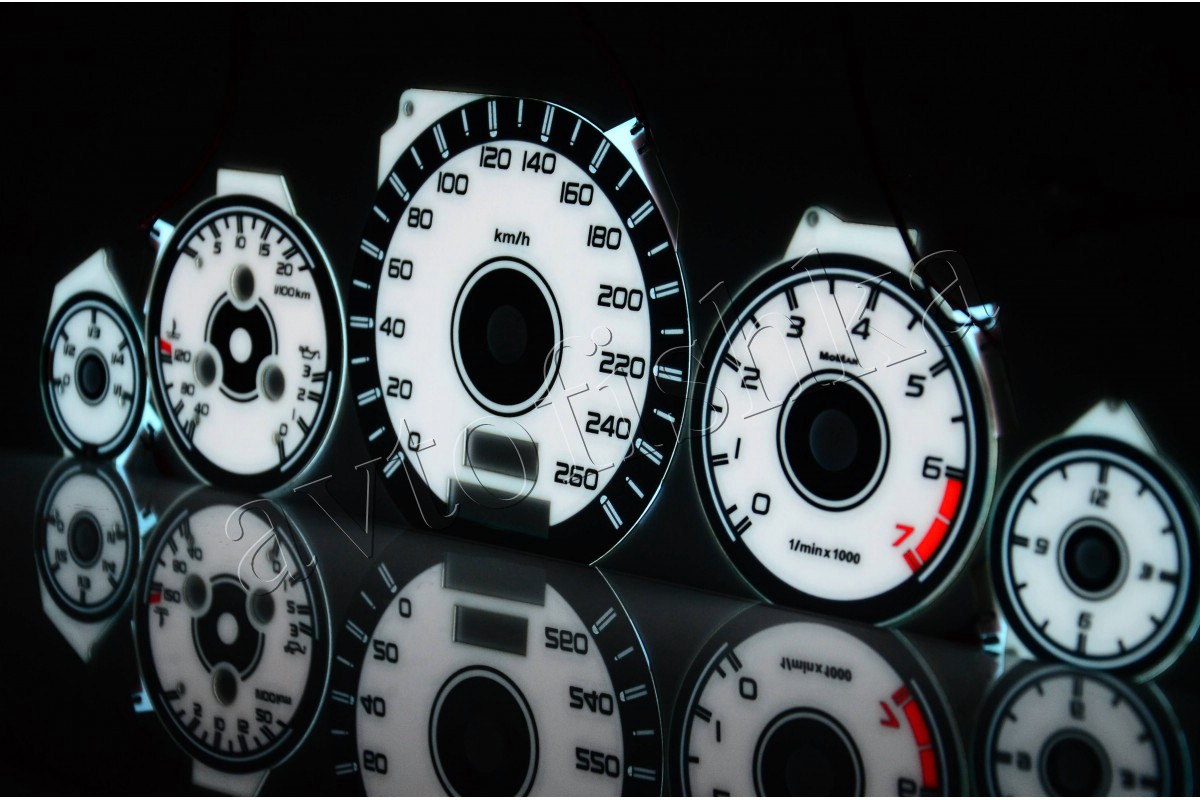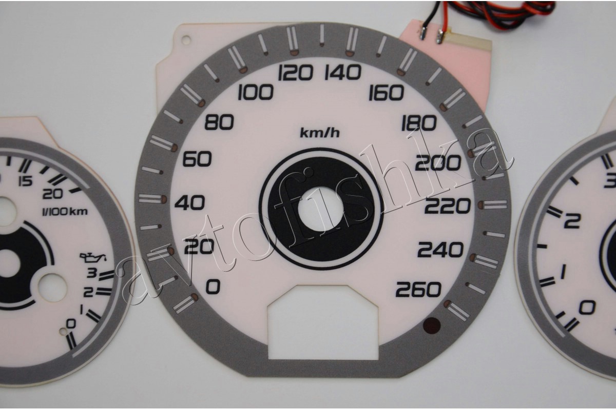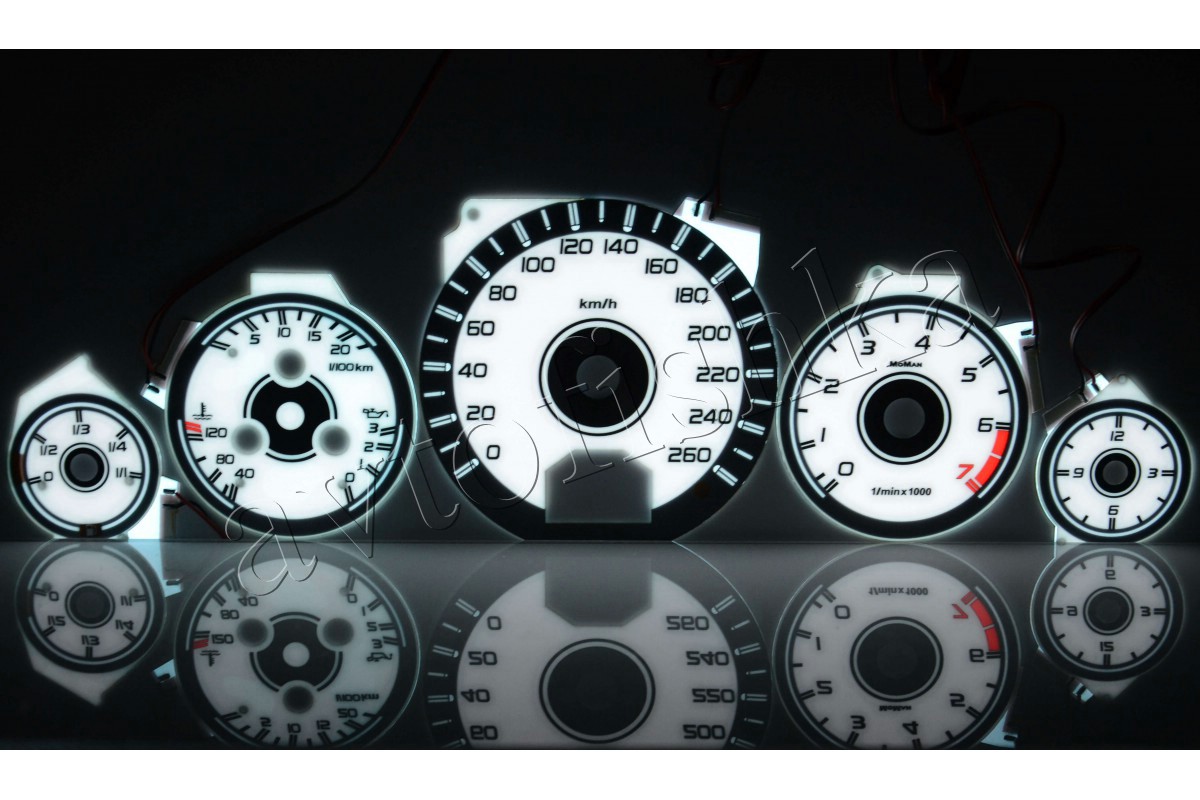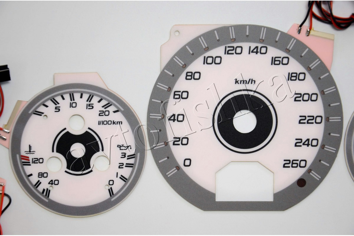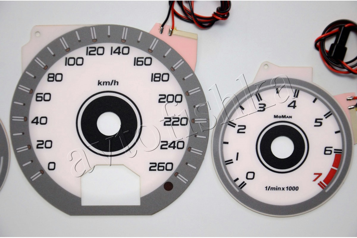 В продаже доступны следующие типы шкал приборов: 160м/час, 220км/час, 260км/час, 5000об/мин, 6000об/мин, 7000об/мин, 8000об/мин Если ваши оригинальные датчики отличаются - например, от диапазона спидометра, диапазона об/мин, расположения отверстий под винты или формы, то, пожалуйста, свяжитесь с нами и мы поможем в подборе. Выбор цвета освещения шкал при боров: