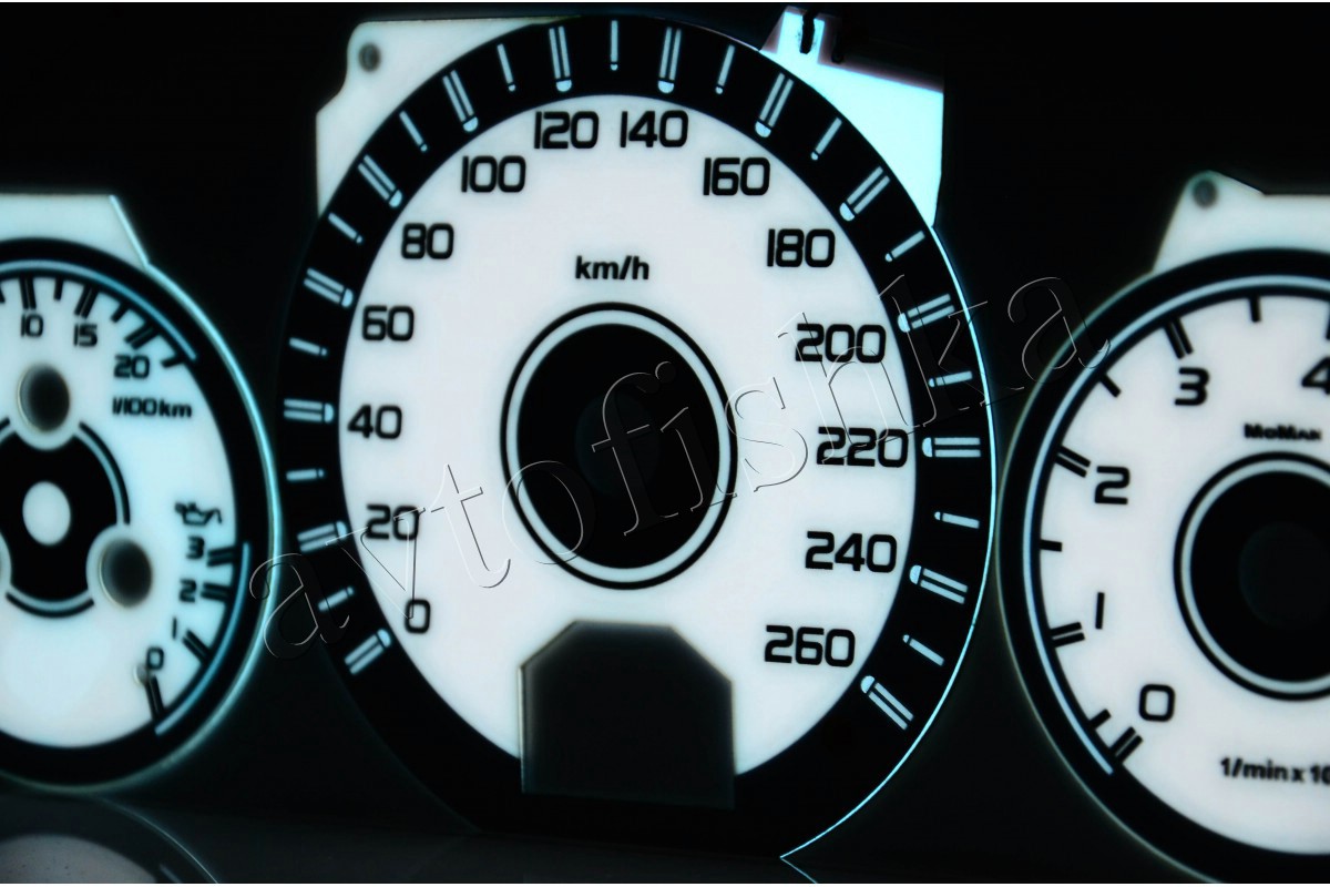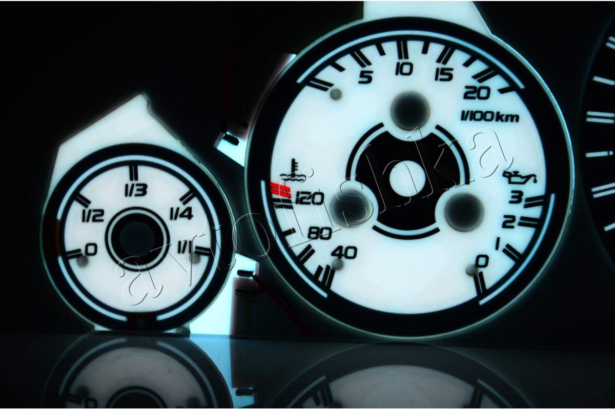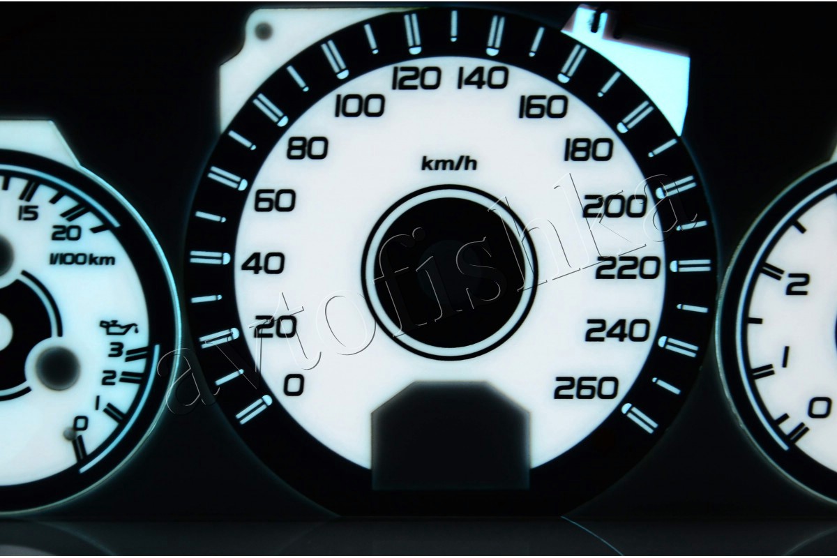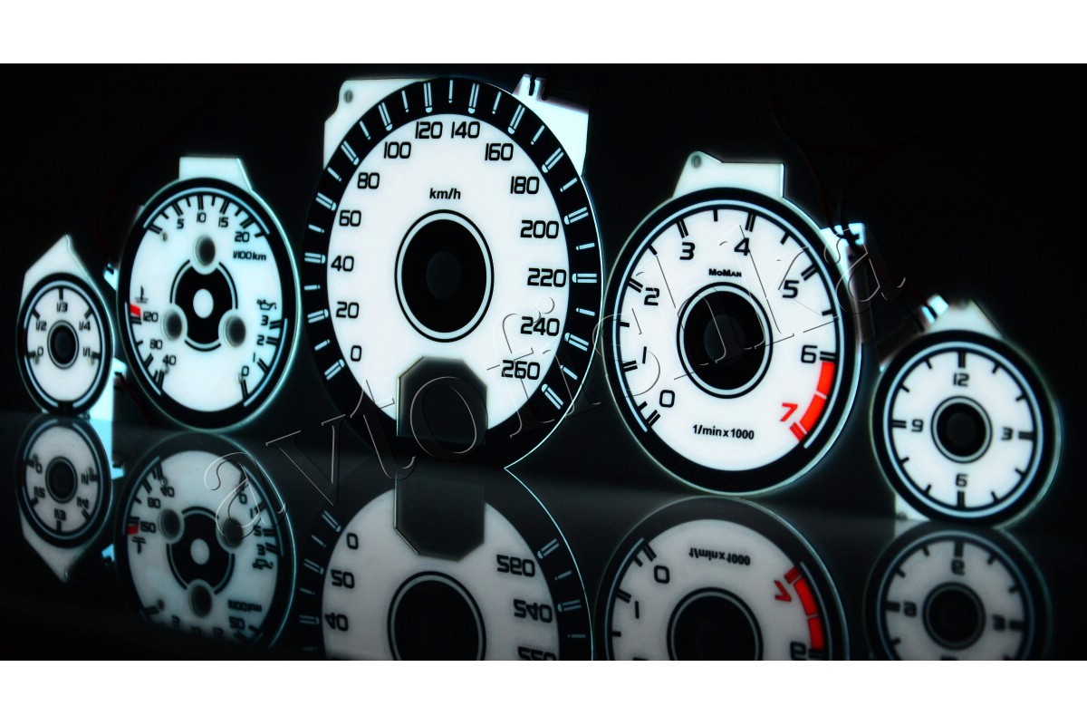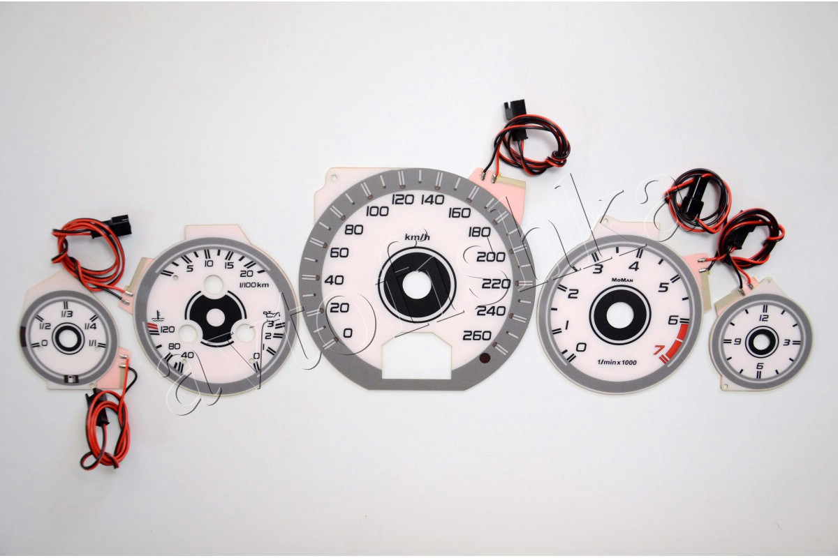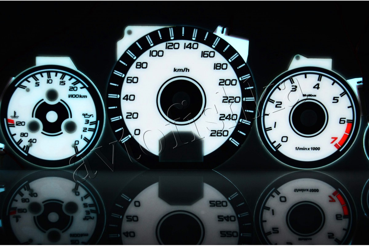 В продаже доступны следующие типы шкал приборов: 160м/час, 220км/час, 260км/час, 5000об/мин, 6000об/мин, 7000об/мин, 8000об/мин Если ваши оригинальные датчики отличаются - например, от диапазона спидометра, диапазона об/мин, расположения отверстий под винты или формы, то, пожалуйста, свяжитесь с нами и мы поможем в подборе. Выбор цвета освещения шкал при боров: