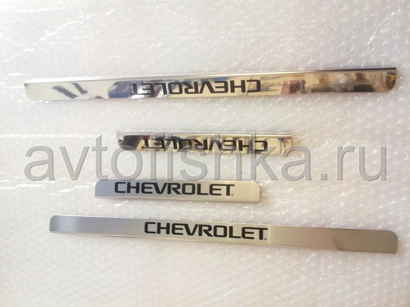 Chevrolet Aveo, Lacetti, Lanos, Niva накладки на пороги дверных проемов, из нержавеющей стали с надписью Chevrolet, комплект 4 шт.