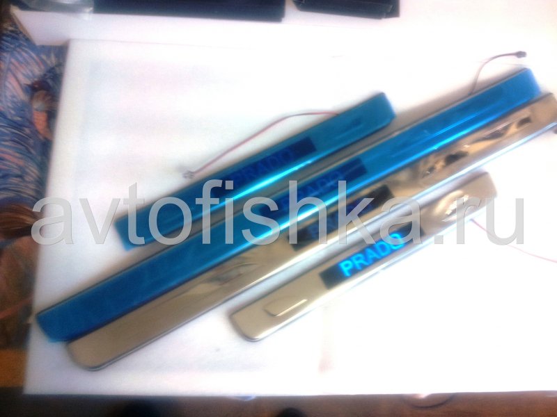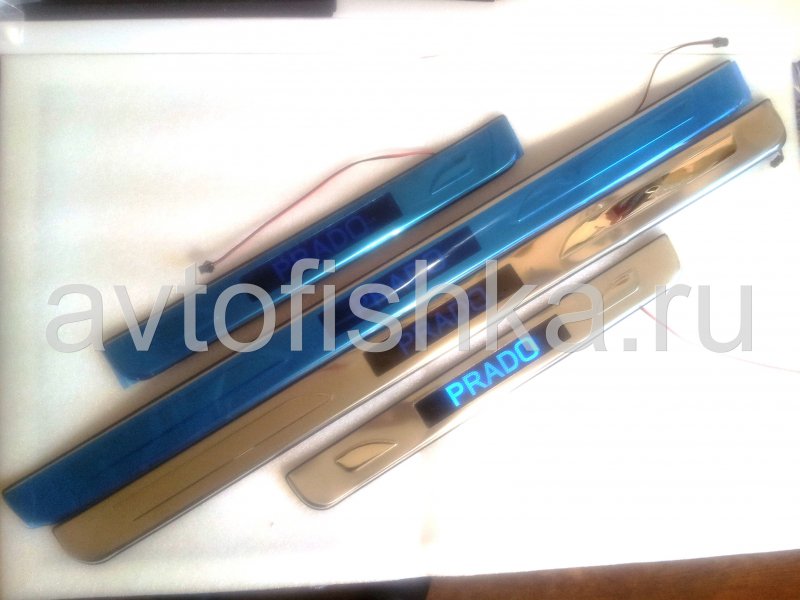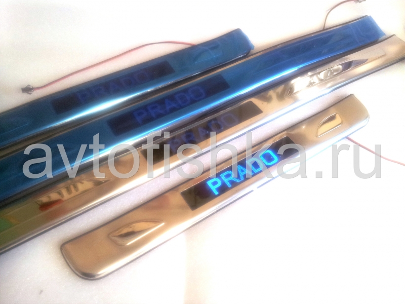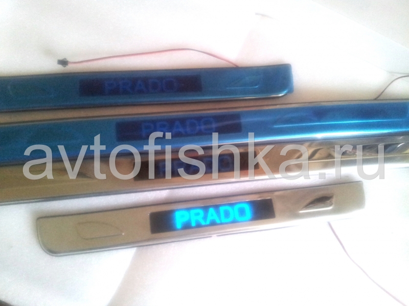 Toyota Land Cruiser Prado 150 (2010-) накладки из нержавеющей стали со светящейся надписью "Prado" на пороги дверных проемов, комплект 4 шт.