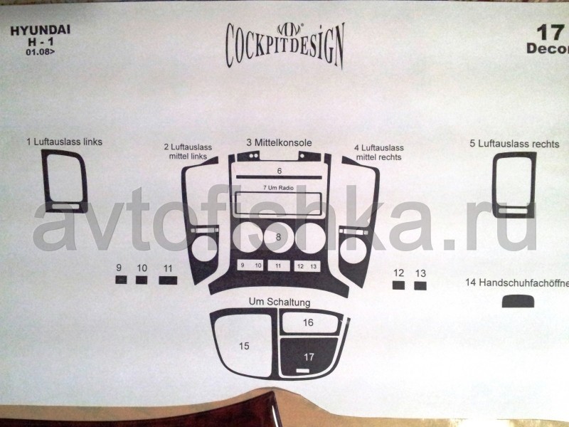 —Hyundai H1 (2008-) накладки в салон под дерево с механической коробкой, комплект 17 предметов.