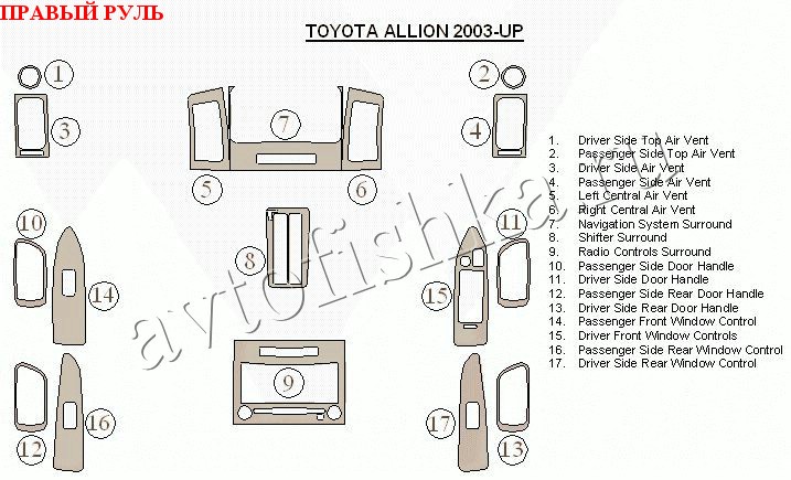 Декоративные накладки на панель приборов | Тюнинг салона для Toyota Allion 2003 – н.в. полный набор накладок в салон, правый руль