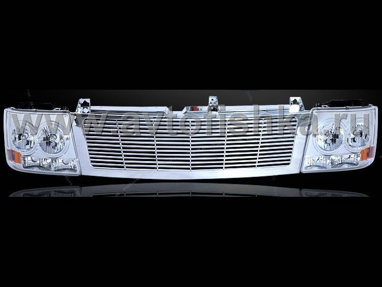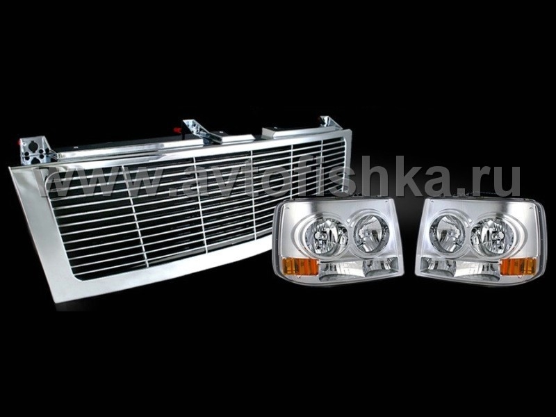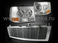 —Chevrolet Tahoe, Suburban, Silverado (99-06) тюнинг комплект - фары передние хромированные, со светящимися ободками и решетка радиатора хромированная, установочный комплект