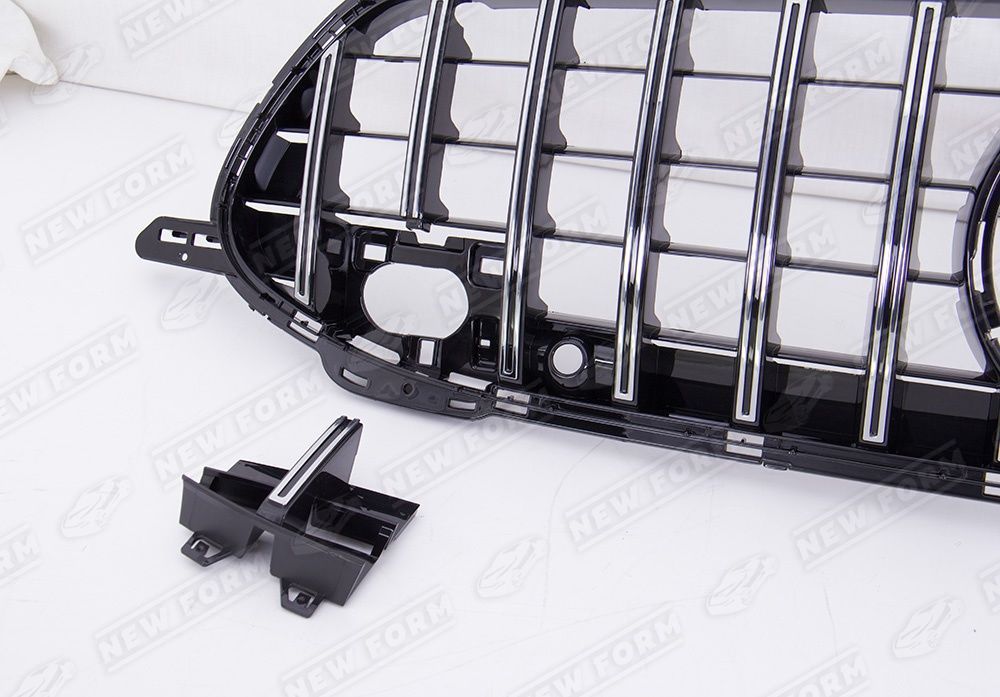 Решетка радиатора хром для автомобилей Mercedes AMG GT C190 рестайлинг. Данная решетка радиатора предназначена для установки на автомобили Mercedes AMG GT C190 рестайлинг с 2017 года выпуска. Решетка радиатора устанавливается в штатные места переднего бампера без доработок. Решетка радиатора выполнена в цвете хром.