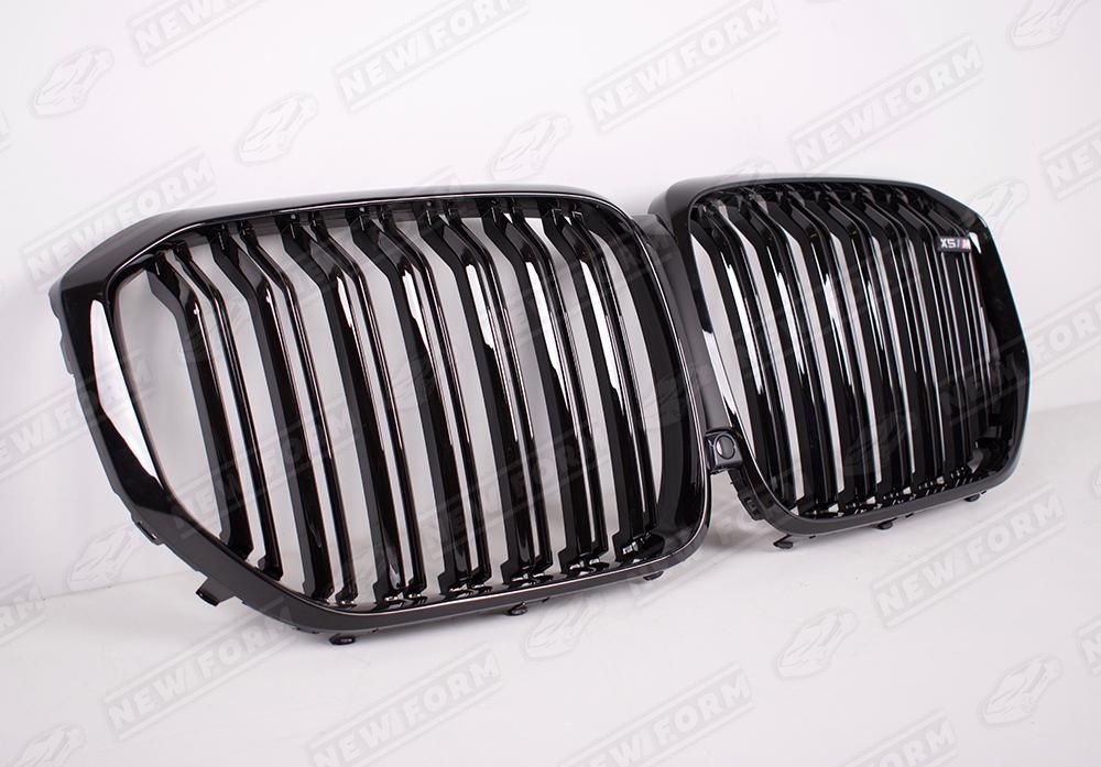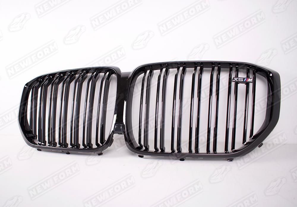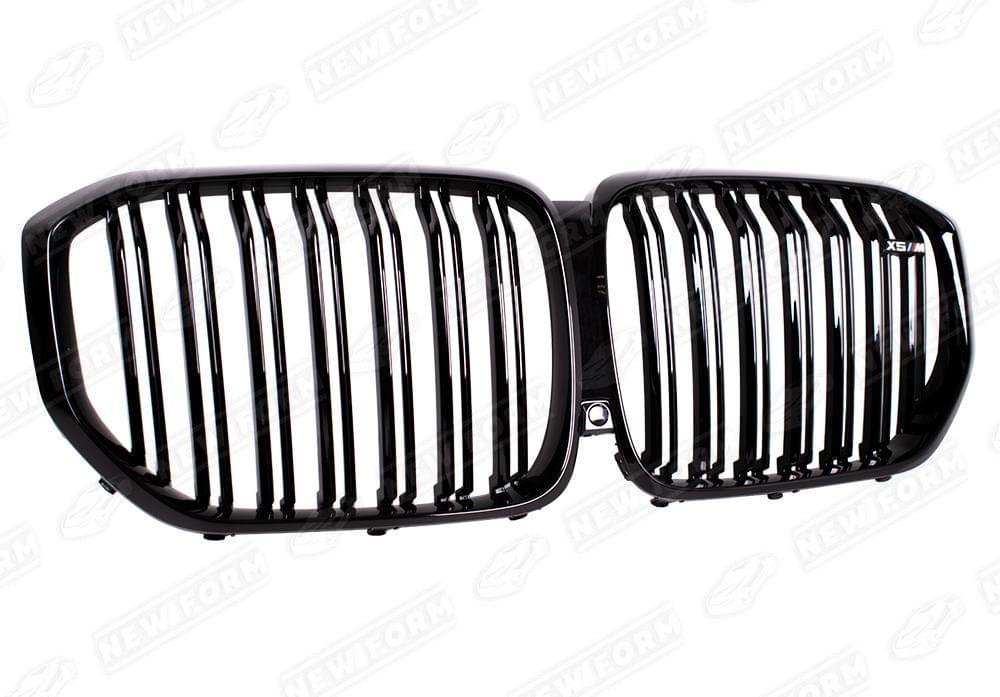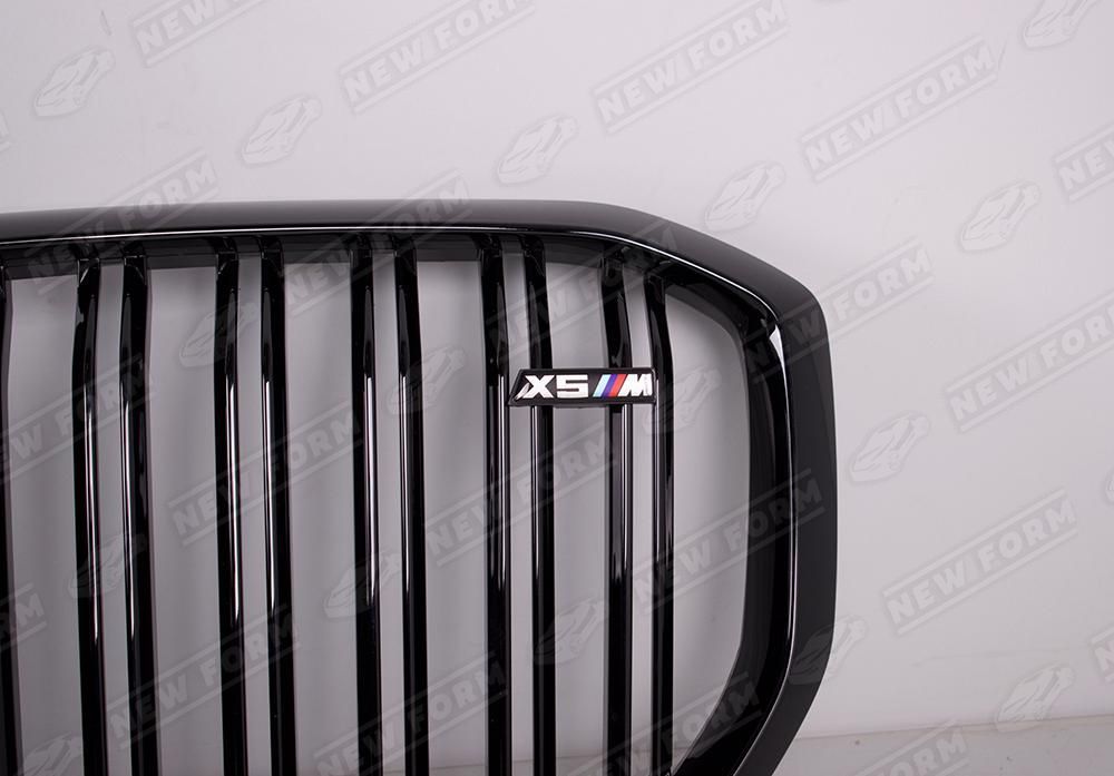 Решетка радиатора X5 M для автомобилей BMW X5 G05. Данная решетка радиатора "ноздри" предназначена для установки на автомобили BMW X5 G05 с 2018 года выпуска. Решетка радиатора устанавливается четко в штатные места переднего бампера без доработок. Решетка радиатора X5 M выполнена в черном глянцевом цвете. На решетку радиатора установлен шильдик X5M.