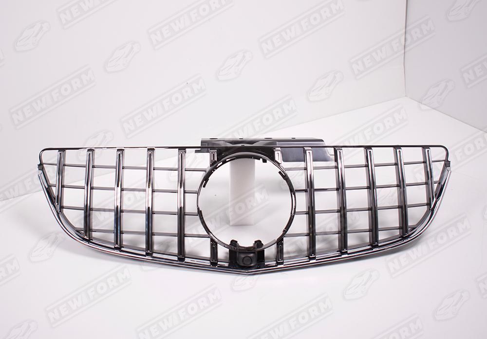 Решетка радиатора AMG GT хром для автомобилей Mercedes E-class Coupe C207 рестайлинг. Данная решетка радиатора предназначена для установки на автомобили Mercedes E-class Coupe C207 рестайлинг с 2013 по 2016 год выпуска. Решетка радиатора устанавливается четко в штатные места переднего бампера без доработок. Решетка радиатора AMG GT выполнена в цвете хром.