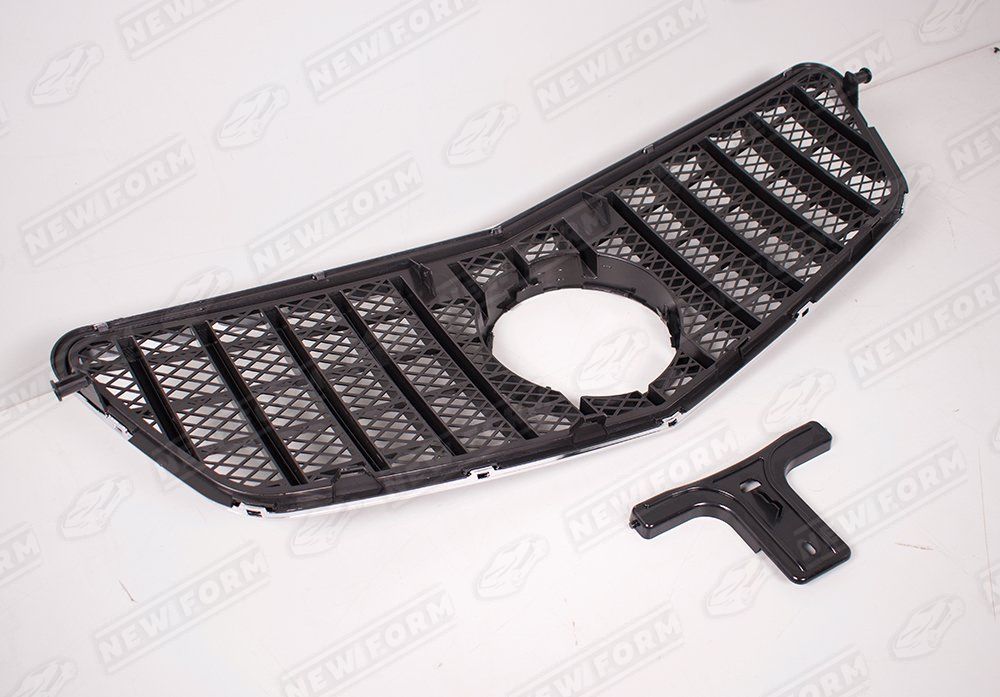 Решетка радиатора AMG GT для автомобилей Mercedes E-class W212. Данная решетка радиатора предназначена для установки на автомобили Mercedes E-class W212 с 2009 по 2013 год выпуска. Решетка радиатора устанавливается в штатные места переднего бампера без доработок. На решетку радиатора установлена защитная сетка. Решетка радиатора выполнена в цвете хром.