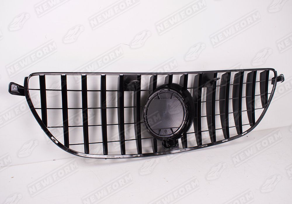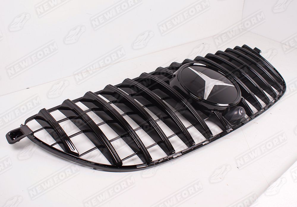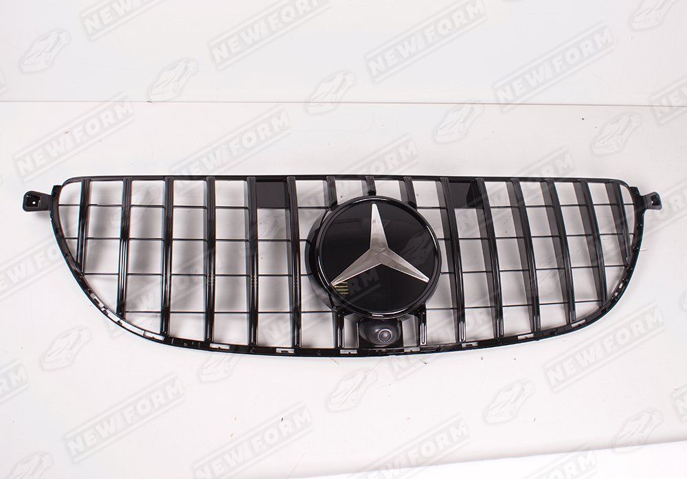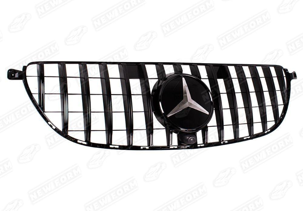Решетка радиатора Panamerica черная для автомобилей Mercedes GLE Coupe C292 6.3 AMG. Данная решетка радиатора предназначена для установки на автомобили Mercedes GLE Coupe C292 с 2015 по 2019 год версии 6.3 AMG или с установленным передним бампером 6.3 AMG. Решетка радиатора устанавливается четко в штатные места переднего бампера 6.3 AMG без доработок. Решетка радиатора выполнена в черном цвете. Стеклянная эмблема Mercedes в решетку радиатора черная.