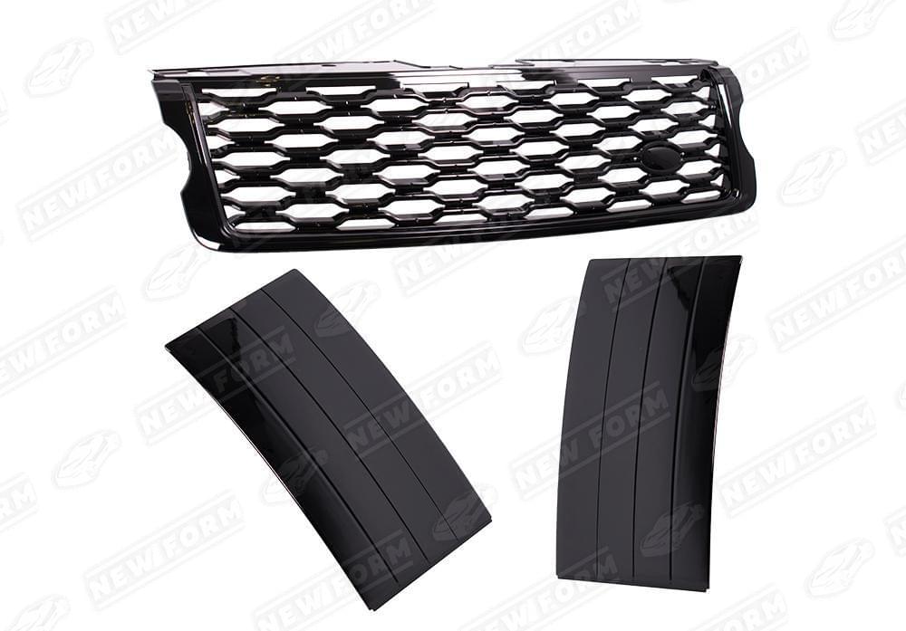 Решетка радиатора черная с черными жабрами стиль 2018 Range Rover Vogue. Данная решетка радиатора предназначена для установки на автомобили Range Rover Vogue с 2012 по 2017 год выпуска. Решетка радиатора с жабрами позволяет изменить стандартную версию автомобиля в версию 2018 года выпуска. Решетка радиатора и боковые жабры устанавливаются в штатные места без доработок.