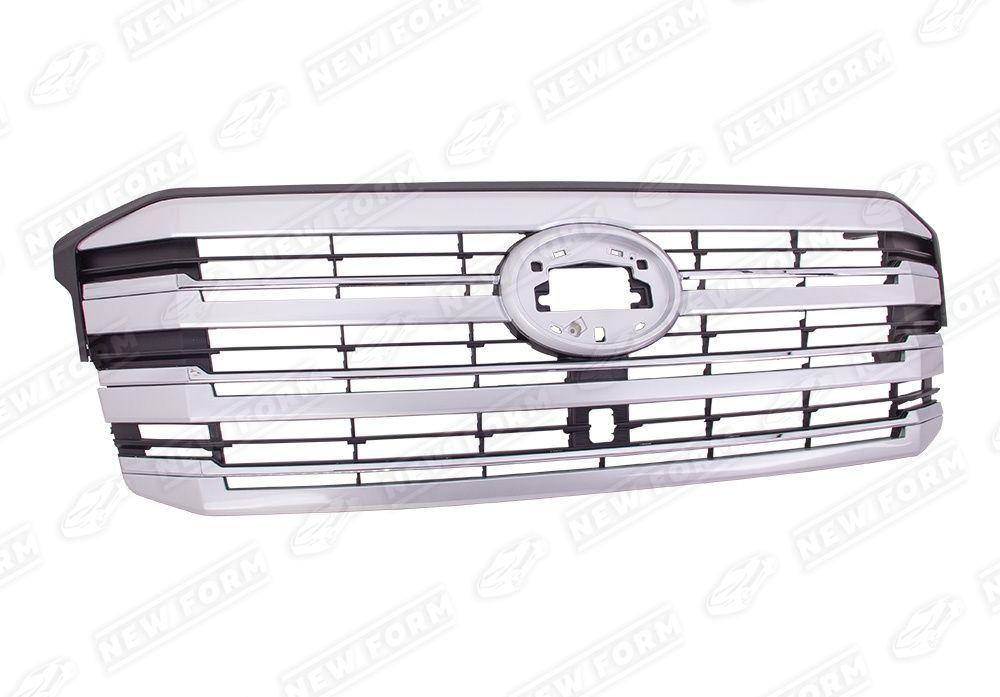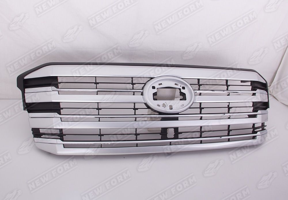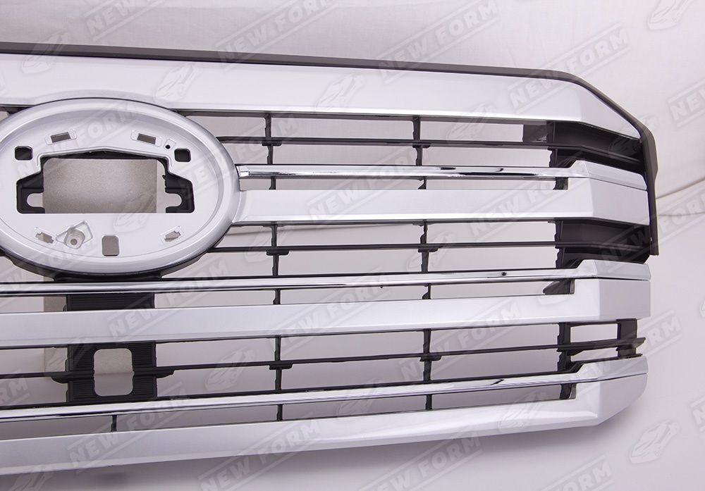 Решетка радиатора для автомобилей Toyota Land Cruiser 300. Данная решетка радиатора предназначена для установки на автомобили Toyota Land Cruiser 300 с 2021 года выпуска. Решетка радиатора устанавливается четко в штатные места автомобиля без доработок. Решетка радиатора выполнена в серебристом цвете.