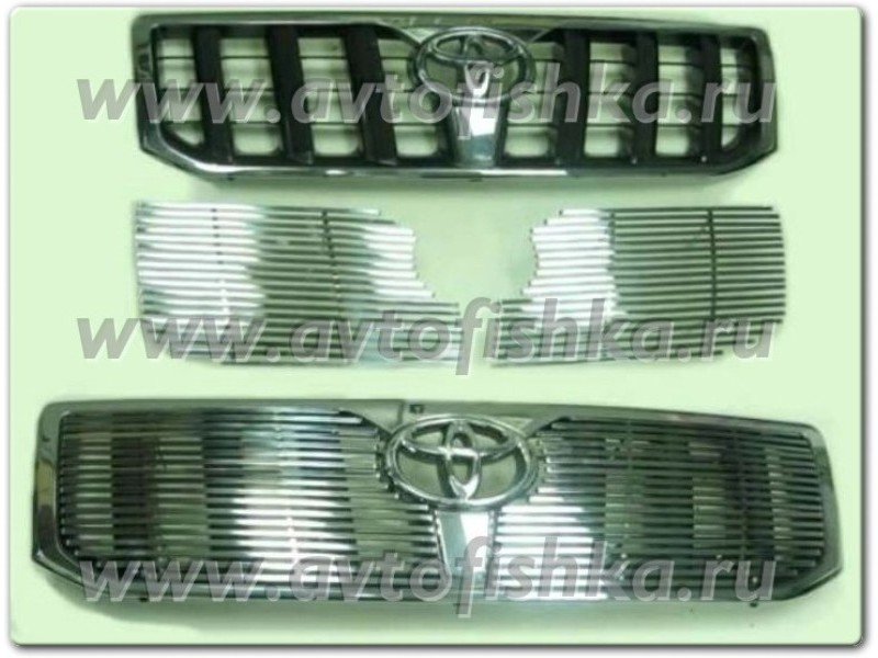 Для Toyota Land Cruiser Prado FJ120 с 2002 года накладка на штатную решетку радиатора. Устанавливается снаружи, на штатную решетку.