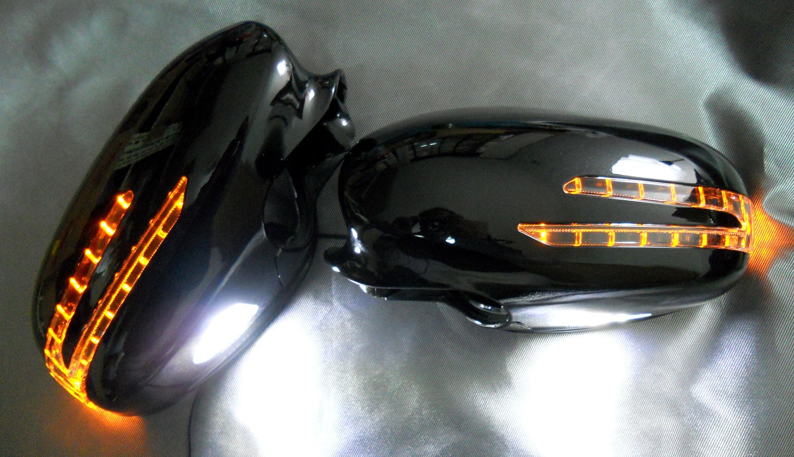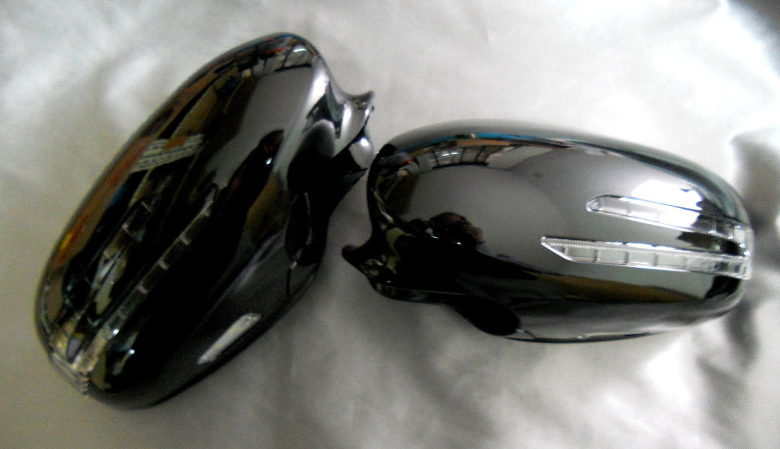 Mercedes W219, W221 (05-09) корпуса боковых зеркал полностью черные (197), с поворотниками "СТРЕЛА" и подсветкой Welcome, комплект 2 шт.