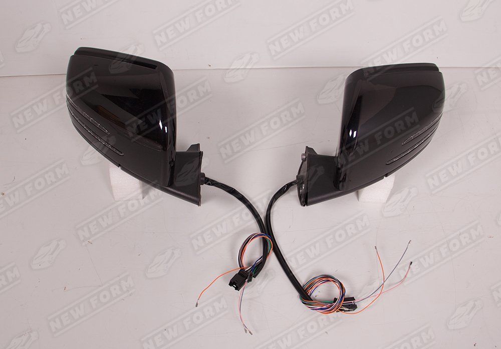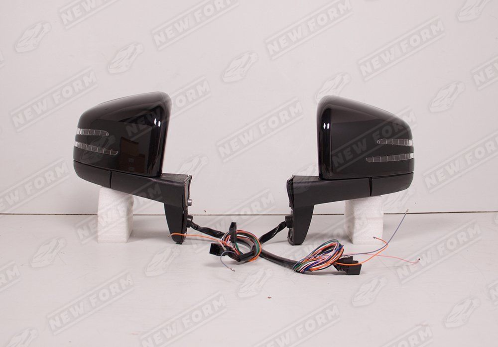 Зеркала рестайлинговые для автомобилей Мерседес Гелендваген. Данный комплект зеркал предназначен для установки на автомобили Mercedes G-class W463 с 1990 по 2018 год выпуска. Зеркала поддерживают функции: автоматическое складывание, повторители поворота, контроль мертвых зон, подогрев. Зеркала устанавливаются четко в штатные места автомобиля без доработок. Зеркала окрашены в черный цвет 197 Obsidian Black.