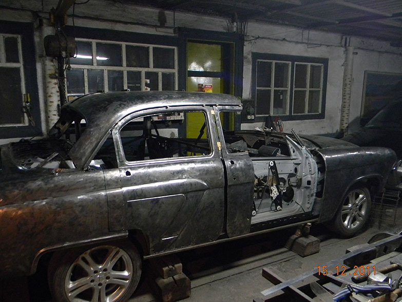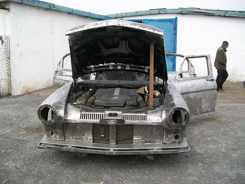 Данная разработка не есть какой-то уникальной, ведь это классический стиль ГАЗ-21. Проекты автомобилей с инновационным шасси немецкого транспорта по сей день пополняют ряды отечественного автопарка. План действий по созданию “Волга” начинался с того, что основой должен был стать Mercedes E500. Два года назад мастерская по тюнингу Simco (г.Казахстан), реализовала этот проект с помощью трех автомобилей ГАЗ-21 «Волга» и одного Mercedes-Benz (кузов W211). В начале, донорный Mercedes-Benz абсолютно раздеребанили, срезав всю крышу и сняв все корпусные панели. В итоге получилось самоходное шасси, которое нужно было представить в новом кузове. Со временем его стали расширять кузовными деталями от ГАЗ-21. Некоторые детали пришлось обрезать на 200-300 мм, так как они были намного шире и длинее уже представленного шасси. Щели, которые образовались во время установки закрывали раскладкой с “Волги”. Проектировщики вынуждены были срезать по размеру все двери, чтобы они подходили под изменившиеся габариты шасси. В связи с этим, приходилось заказывать стекла, и переднюю решетку бампера по эксклюзивным чертежам.